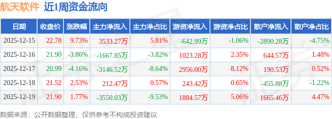 资金流向数据方面,本周航天软件主力资金合计净流出4618.68万元,游资资金合计净流入5464.27万元,散户资金合计净流出845.59万元。本周资金流向一览见下表: